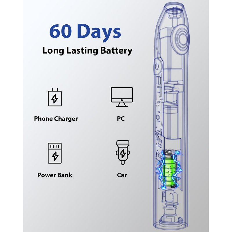 - 60 Days Long Lasting Toothbrushes, Wireless Charge, IPX7 Waterproof - Electric toothbrush will last 60 days on a full charge, 800mAh battery it has an incredible battery life. IPX7 waterproof to be used for bath or shower.