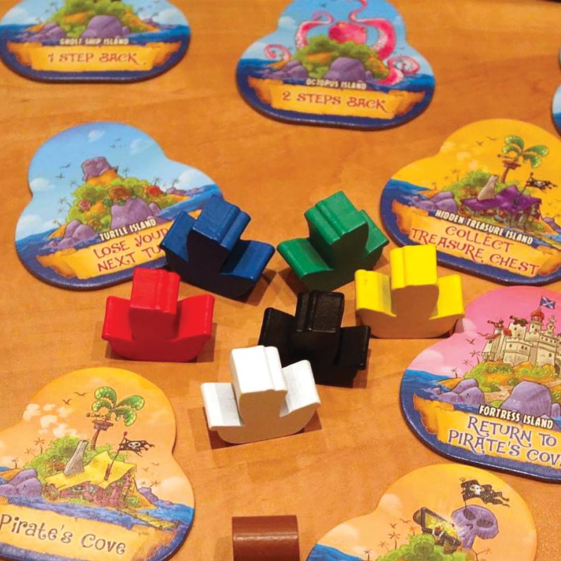 - INCLUDES: 6 wooden ship tokens, 1 wooden die, 1 wooden treasure chest token, 40 thick and durable island tiles, linen paper, and colorful instructions. Quality construction!