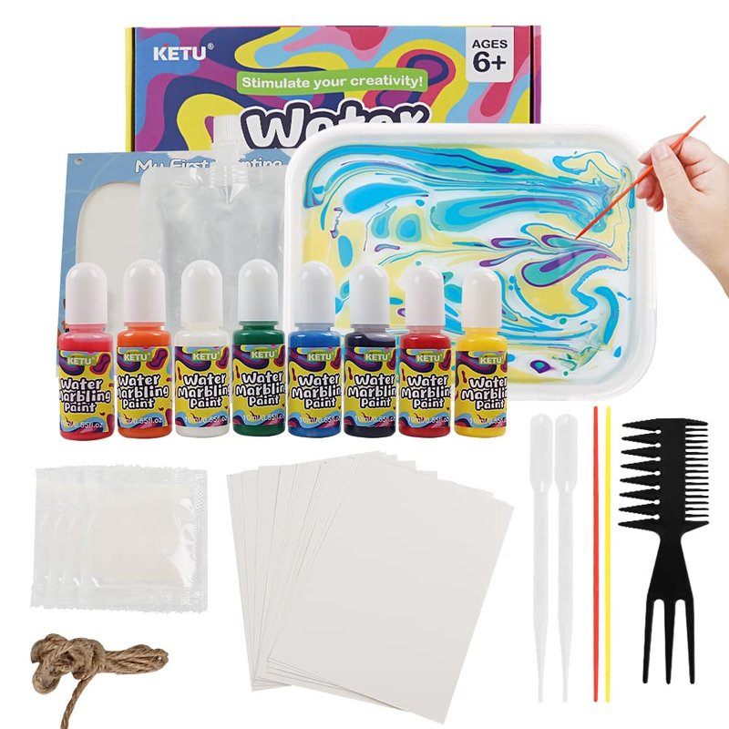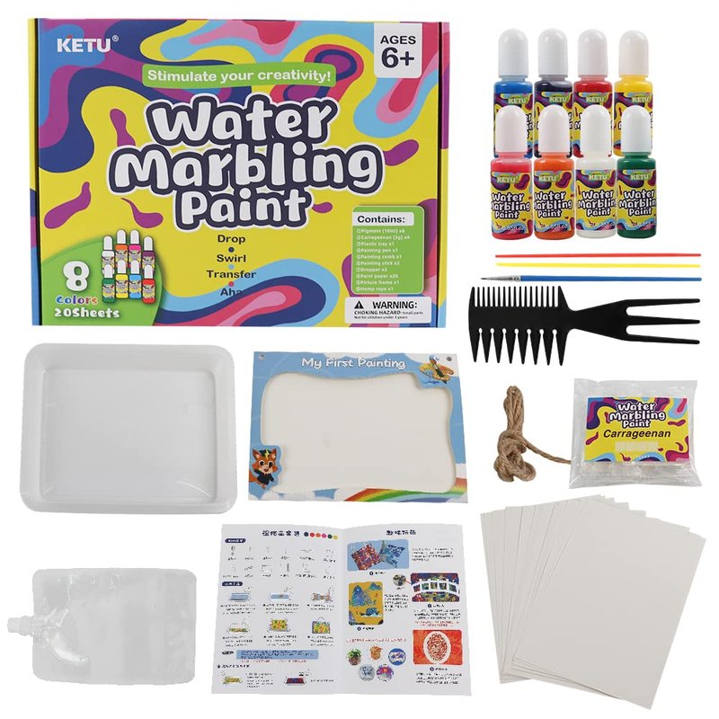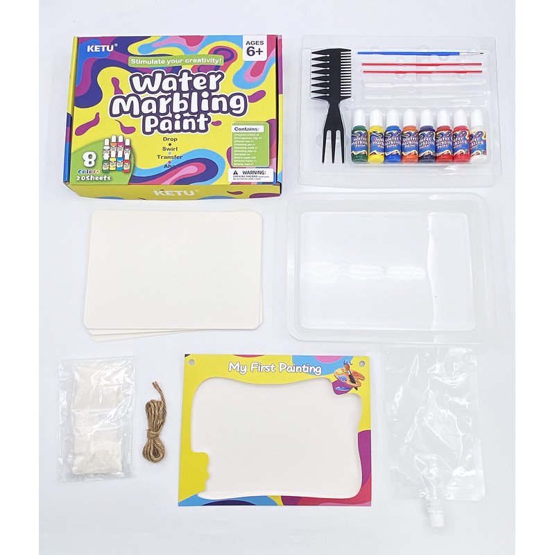 - Interesting Water Marbling Painting Kit :Instead of painting on paper or canvas, try painting on... water! Our marbling painting process lets you create artwork in a new way. As soon as they starting the item,several hours of art craft with family or friends. Marble paint attracts children to create, which helps to stimulate their creativity and imagination, cultivate children's color and artistic cognition. We can cooperation with our kids, which will suitable for early education parent-child interaction. Water marbling painting kit is a perfect art kit & gifts for indoor activities on rainy days .