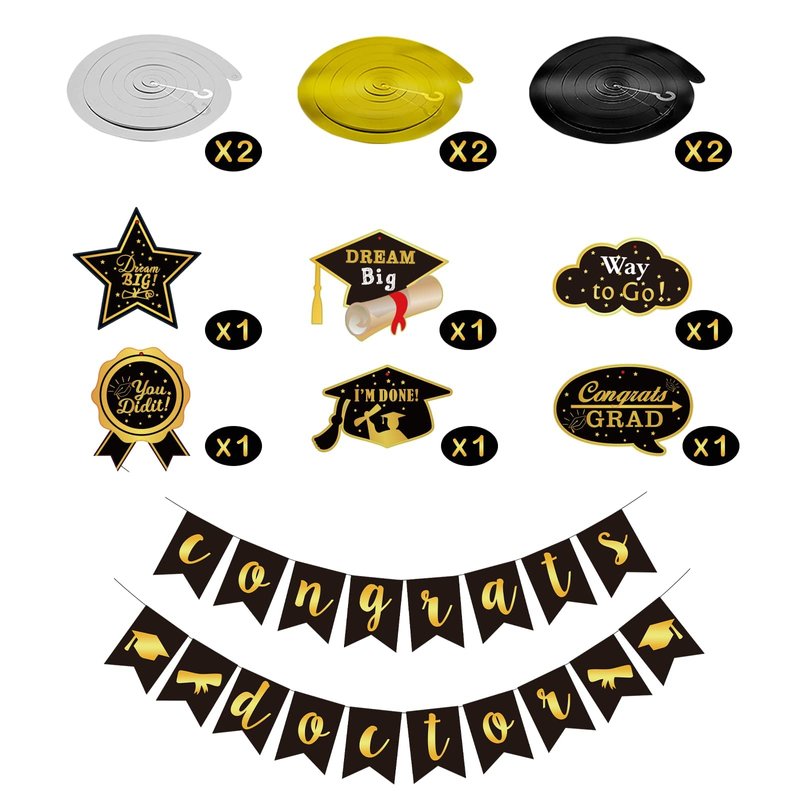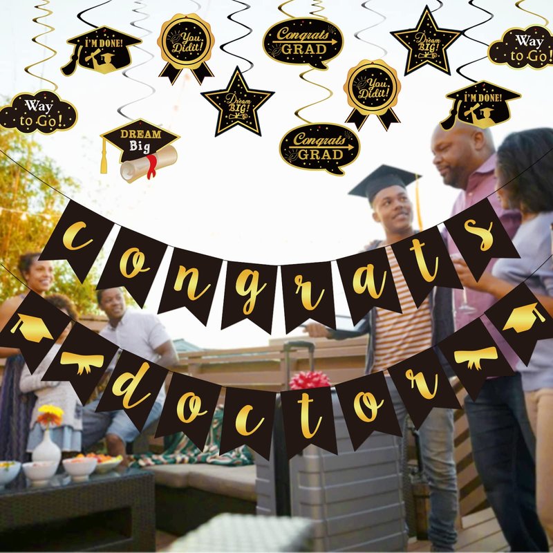 - ๐จโ๐ ๐จโ๐ใWhat You Will Getใ:1 set black gold glitter congrats doctor banner,6pcs different congrats streamers congrats swirl and 6pcs sliver&gold&black swirl.Supply a lovely grad theme party,Perfect graduation party decorations,doctor party decorations!