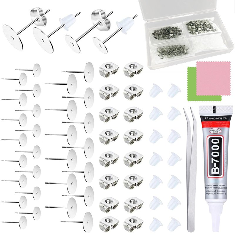 - Earring Making Supplies Kit:Comes with 2 different sizes of earring posts, including 55 pairs 4mm stud earring backs, 55 pairs 6mm earring pin studs,200pcs stainless steel earring backs and 240 pieces rubber earring backings,1 pcs clear earring glue and Tweezers, 2 silver polishing cloth,1 Box