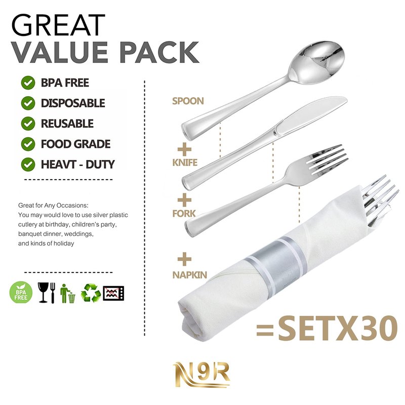 - SHINING YOUR TABLE: N9R disposable silverware will outshine any white or clear plastic flatware set which is shining your table setting with silver plastic silverware set at any party theme.