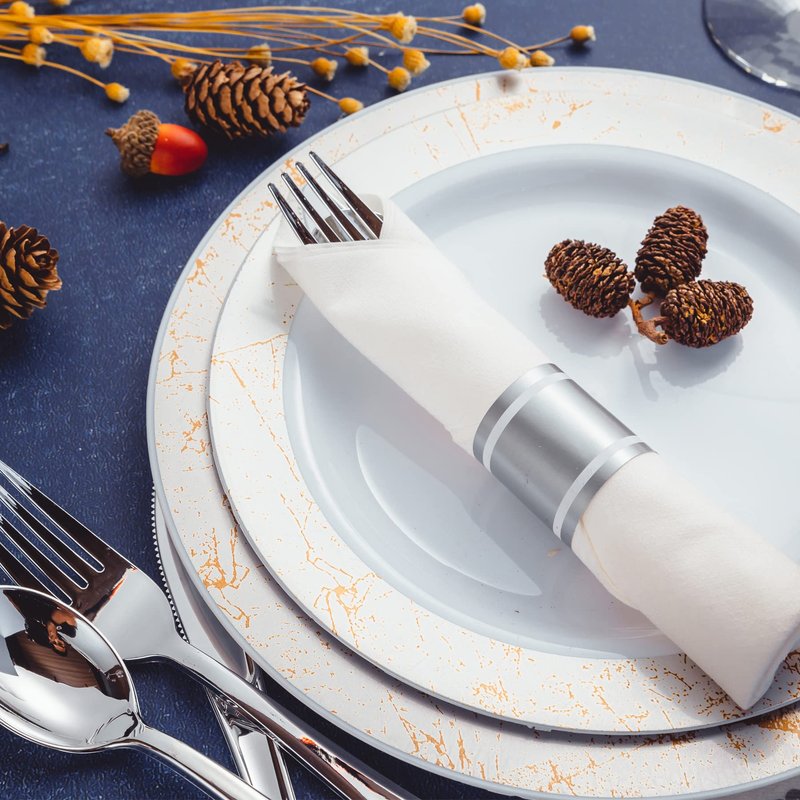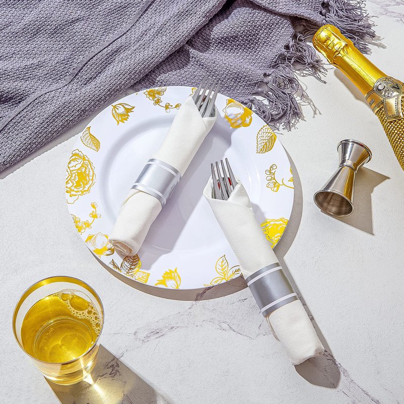 - PRE- ROLLED: As a perfect wedding reception tableware, you don't have to buy napkins. Our silver plastic cutlery with this pre rolled napkins make your events easier.