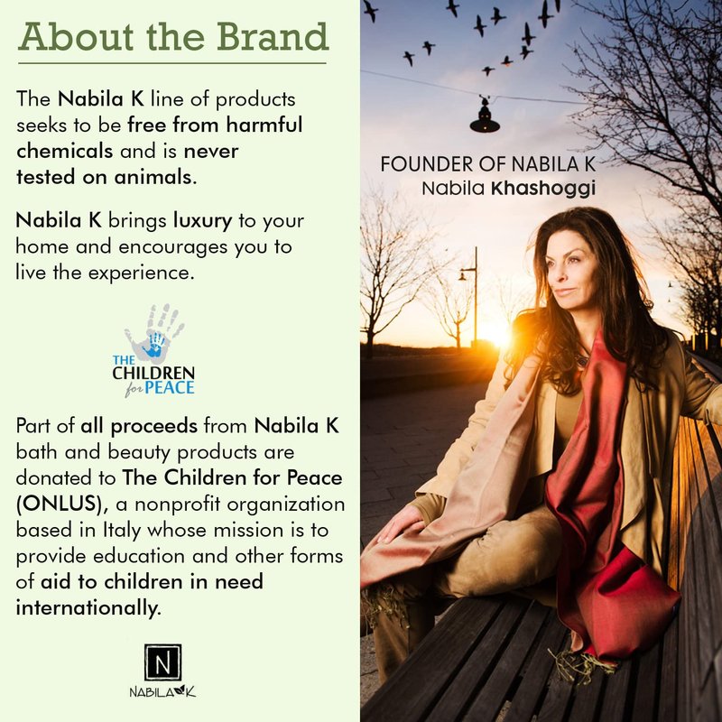 - The ingredients in these are 90% natural, 72% organic, and free of sulfates and parabens. Multiple essential oils are carefully blended to create a perfect fragrance and relaxing experience. Nabila K combines the best elements from natural world environments. The goal is to create an unforgettable bath time experience--relaxing and nourishing the body while clearing and invigorating the mind. Please review the list of ingredients. Cruelty free, not tested on animals.
