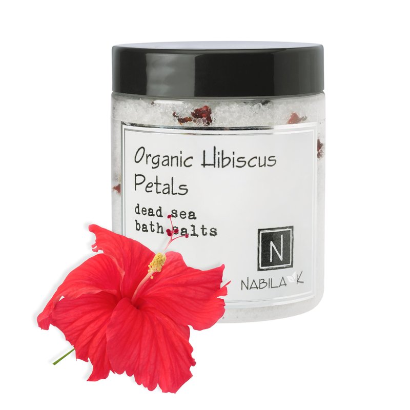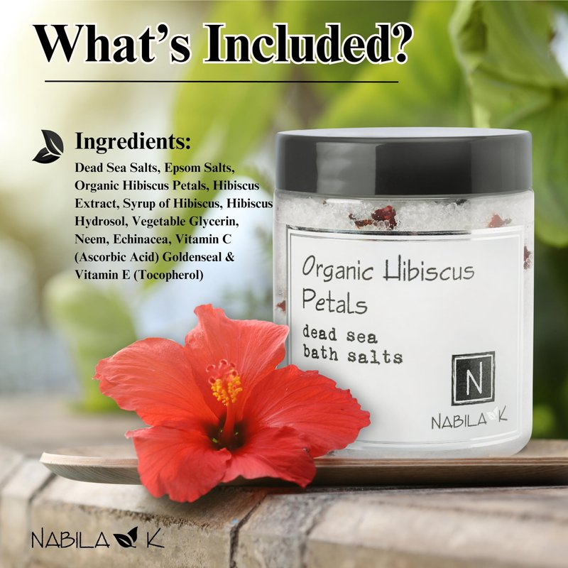 Nabila K Organic Bath Salts - Dead Sea Salt & Epsom Salt Scrub & Bath Soak - Exfoliates & Hydrates The Skin - Botanical Essential Oils & Extracts - Hibiscus Petals - 9.5 oz