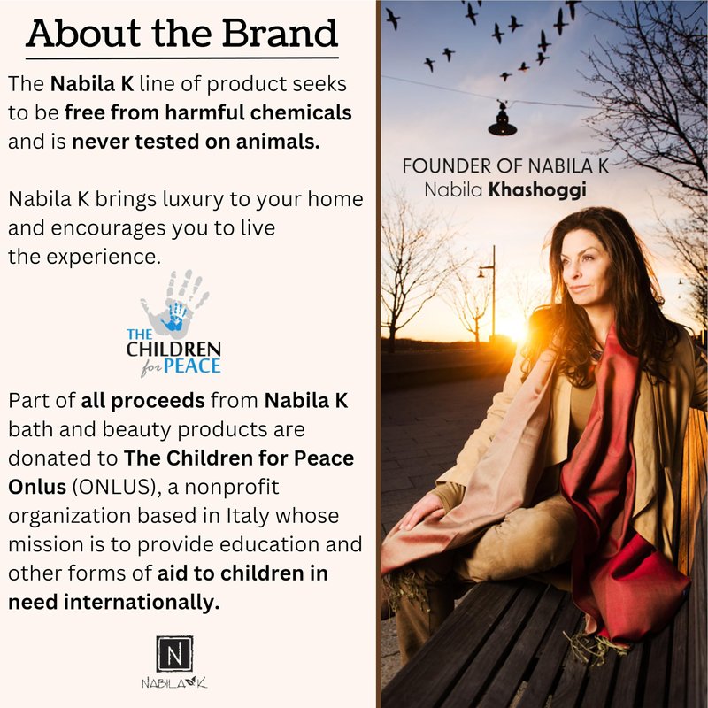 A portion of all proceeds from N Nabila K bath and beauty products is donated to The Children for Peace Onlus (ONLUS) a nonprofit organization based in Italy whose mission is to provide education and other forms of aide to children in Third World countries.