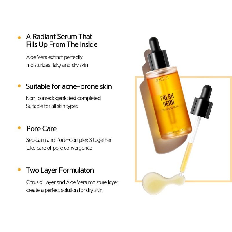 - Hydrating Anti-Aging Serum: Experience the benefits of our Fresh Herb Origin Serum (Anti-aging) 50ml. Crafted with Aloe Vera Leaves and Botanical Oil, it provides a moisture coating for a radiant finish. Patented Sepicalm, derived from lotus flower extract, offers anti-aging effects, boosts skin moisture by 1.5 times, and aids in pore refinement with the pore complex-3