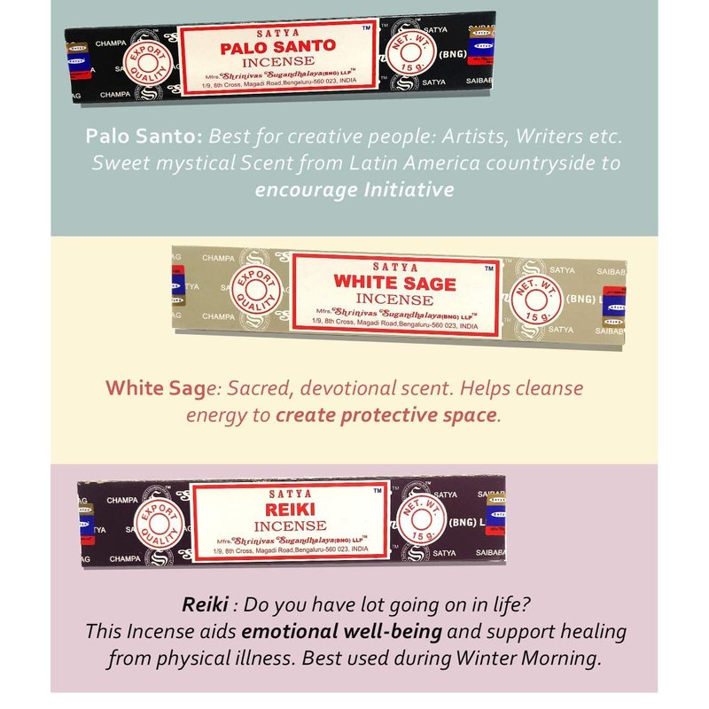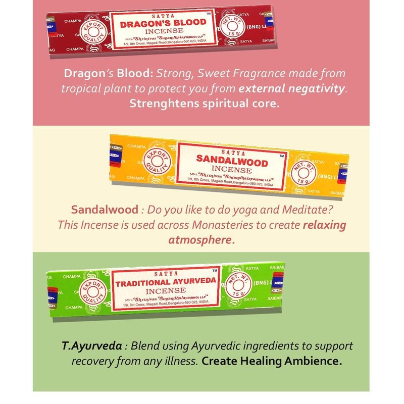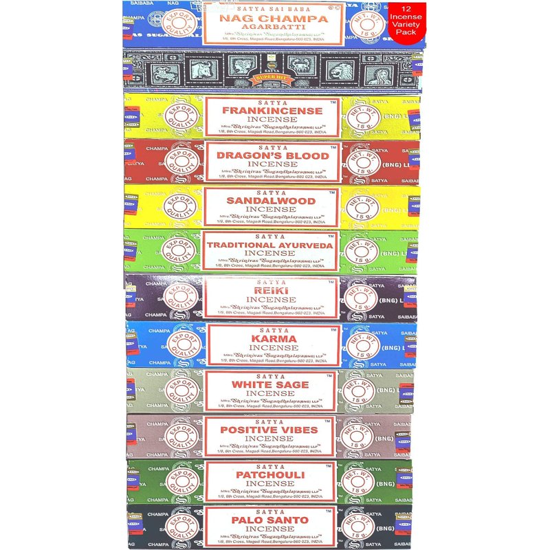 Try today the Assortment of Top Selling Satya Incense Sticks - Incense Set has 12 different incense stick variants : Original Satya Nag Champa, SuperHit, SandleWood, Patchouli, Dragonsblood, White Sage, Reiki, Traditional Ayurveda, Palo Santo, Spiritual Healing, Karma and Frankincense. The Best Features and with Care - Traditional Handrolled technique is used to make this as this ensure better natural earthy fragrance instead of soapy smell of machine made ones. Soothing Relaxing Aromatic Sticks - Immediate relief from all anxiety whether it is work, family or other stress. Thus helping us to increase our efficiency. Masks All Bad Smell - Use after fish cooking, exercise or even toilet Meditation kit - Burn these atleast 30 minutes before meditation or yoga as it calms nerves and improve focus. - Useful as Reiki Supply, Spiritual decor and Celestial decor. The Perfect Gift - It makes an excellent gift for any occasion - birthdays, holidays, housewarming etc. Not to mention it is treasure trove for Hippies. We Ensure You - Reliable and quality checked products - Friendly and Fast Customer Service Order Now! Our Satya Nag Champa Incense Sticks Variety Pack is in high demand both at Amazon and other sites, go to the top of the page and click Add to Cart now, before it's out of stock! (Satya Bangalore Product - Always check for Earth Logo with Leaf to determine authenticity)
