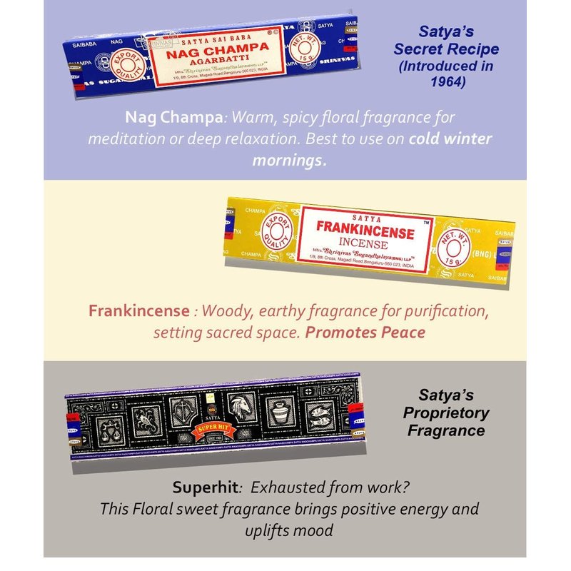 - BEST SELLING VARIANTS OF SATYA SAI BABA NAGCHAMPAThis incense sticks variety pack has NagChampa, Sandalwood, White Sage, Frankincense, Dragon's Blood, Super Hit, Reiki, Ayurveda, Karma, Spiritual Healing, Palo Santo and Patchouli Incense Sticks