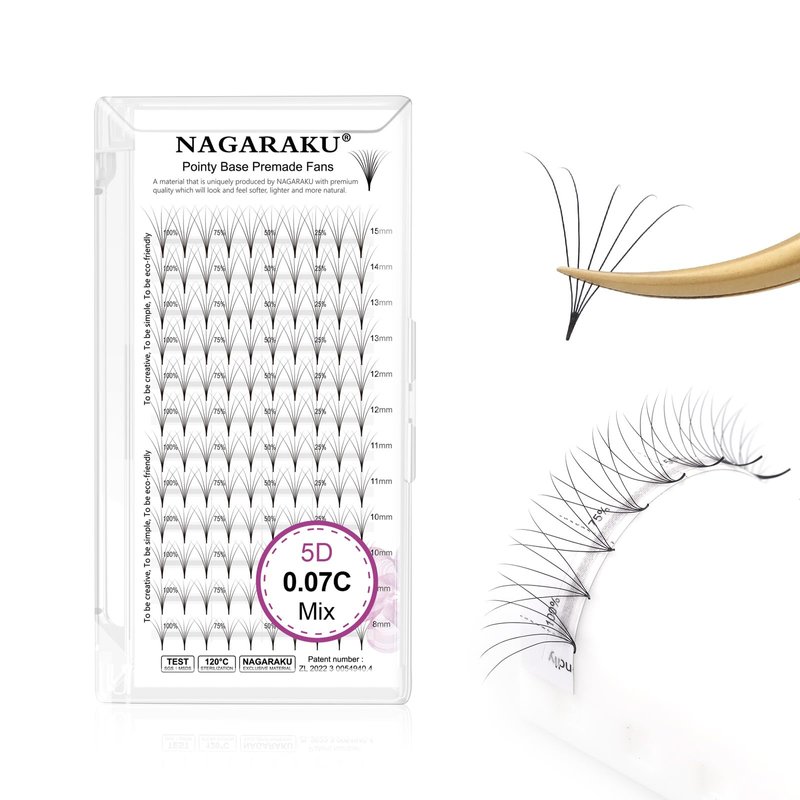 NAGARAKU Premade Fans Eyelash Extensions Premade Volume Fans Lash Extensions 120 Fans 5D 0.07C Curl 8-15mm Mix Sharp Narrow Stem Clusters Thin Pointy Base Russian Fans Ready Volume Premade Lash Fan