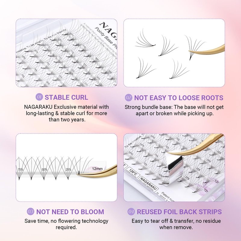 - STABLE CURL: Premade fan eyelashes are made of high-quality PBT material, which are very soft and lightweight. NAGARAKU exclusive material and craftsmanship keep the curl of the eyelash extension longer and no glue residue. Our NAGARAKU special curlstandard can keep stable for more than 2 years.