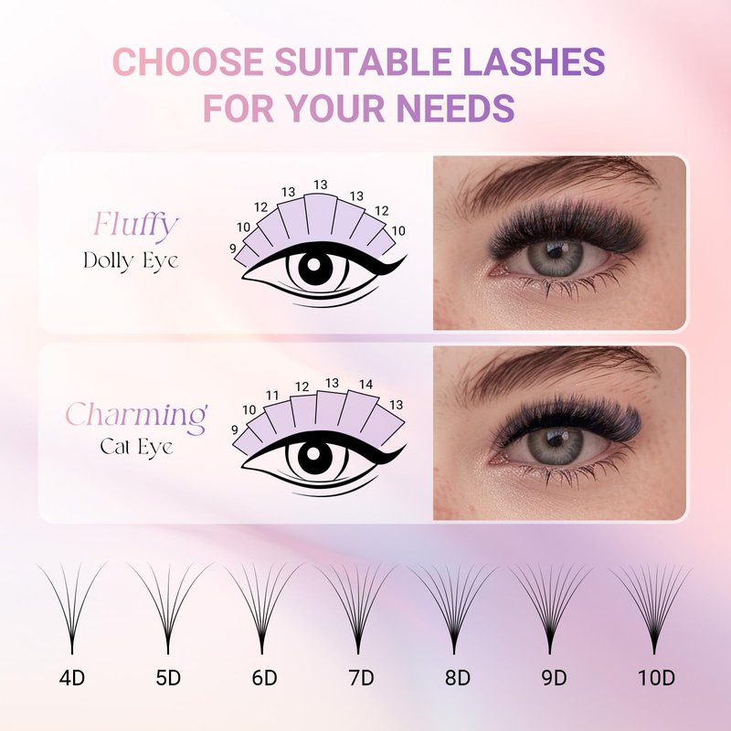 - WIDER APPLICATION:Premade Fans Eyelash Extensions have 120 fans one tray . Available in 3D 4D 5D 6D 7D 8D 9D 10D, 0.07 mm , C and D curl , 8 to 15 mm single length and 8 to 15 mixed length. According to your needs, grafting 3D to10D pre made lashes can save you a lot of time. Super suitable for professional salon artists.
