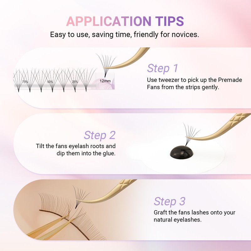 - SAVING TIME: Premade fans volume lashes can speed up the process of applying the lashes. You can have more time to serve more clients. Please grab eyelash base with your tweezers gently to avoid break or fall part. You don’t need skills to make fans with tweezers by yourself, so you can finish a volume eyelash extension in a short time.