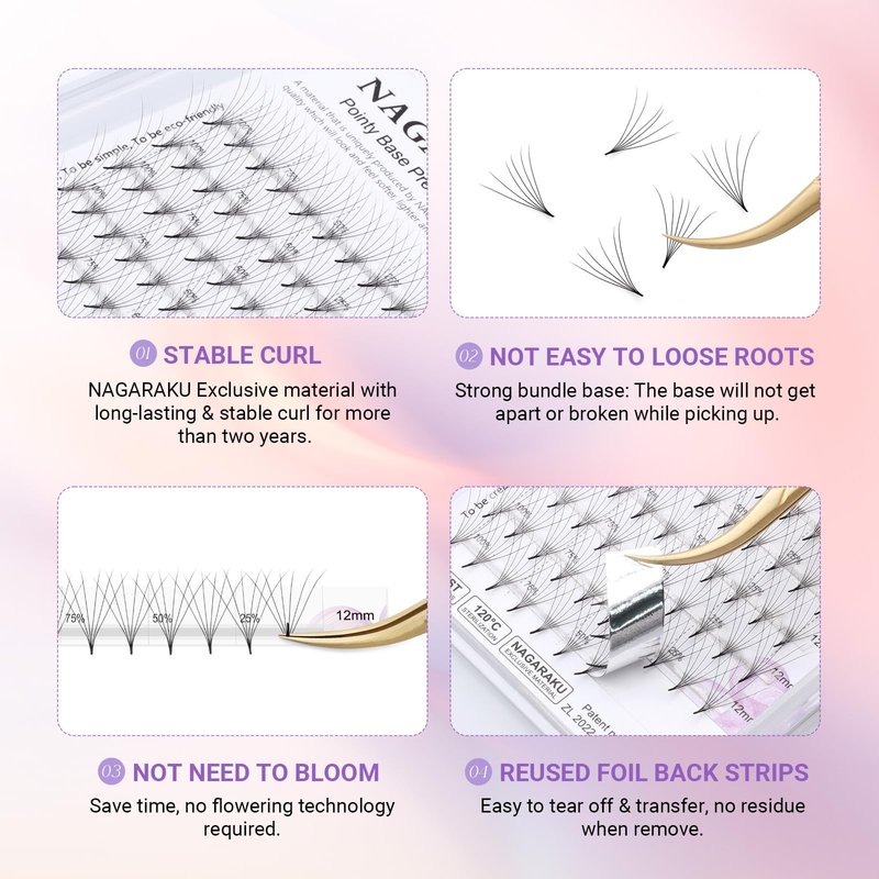 - STABLE CURL: Premade fan eyelashes are made of high-quality PBT material, which are very soft and lightweight. NAGARAKU exclusive material and craftsmanship keep the curl of the eyelash extension longer and no glue residue. Our NAGARAKU special curlstandard can keep stable for more than 2 years.