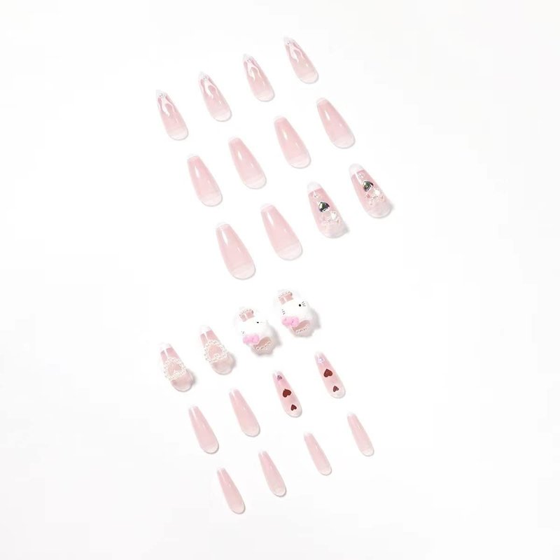 Nail Apparel Y2K Long Coffin Cute Kawaii Press on Nails 3D Cartoon Glitter Rhinestone Heart Pearl Bow Flame Long Ballet Trapezoid Fake Nails 24Pcs (White Flame Kitty)