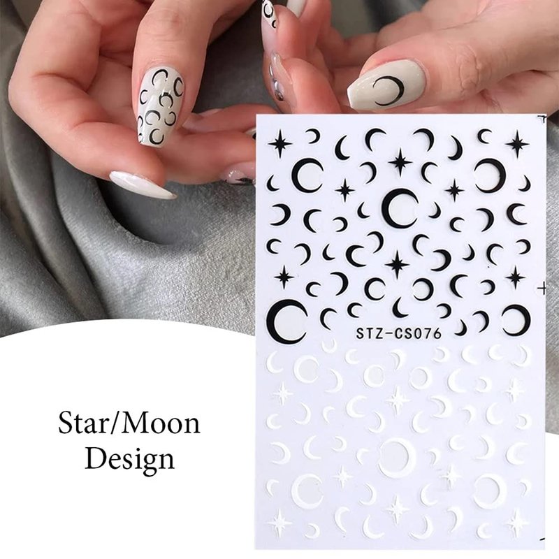 - Fashion Nail Stickers: you will get 4 sheets 2021 fashion trend adhesive nail art stickers, a variety of design options, including funny mosaic, smile, fire, rose, heart, star, moon, line, eye