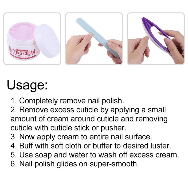 1. Package included 1pcs of nail art buffering cream, 1pcs of nail art brush buffer and 1pcs of polishing strip.
