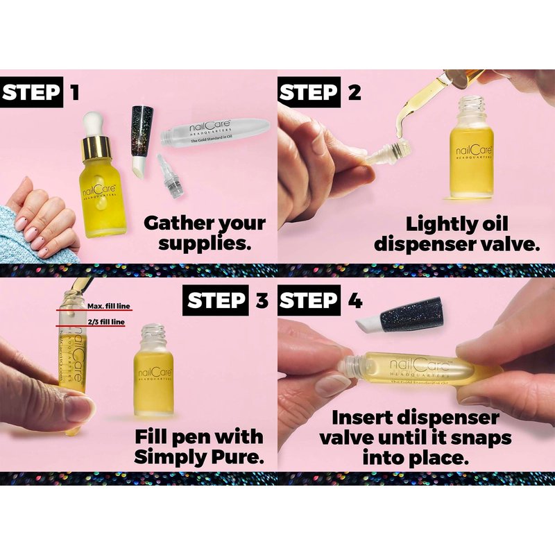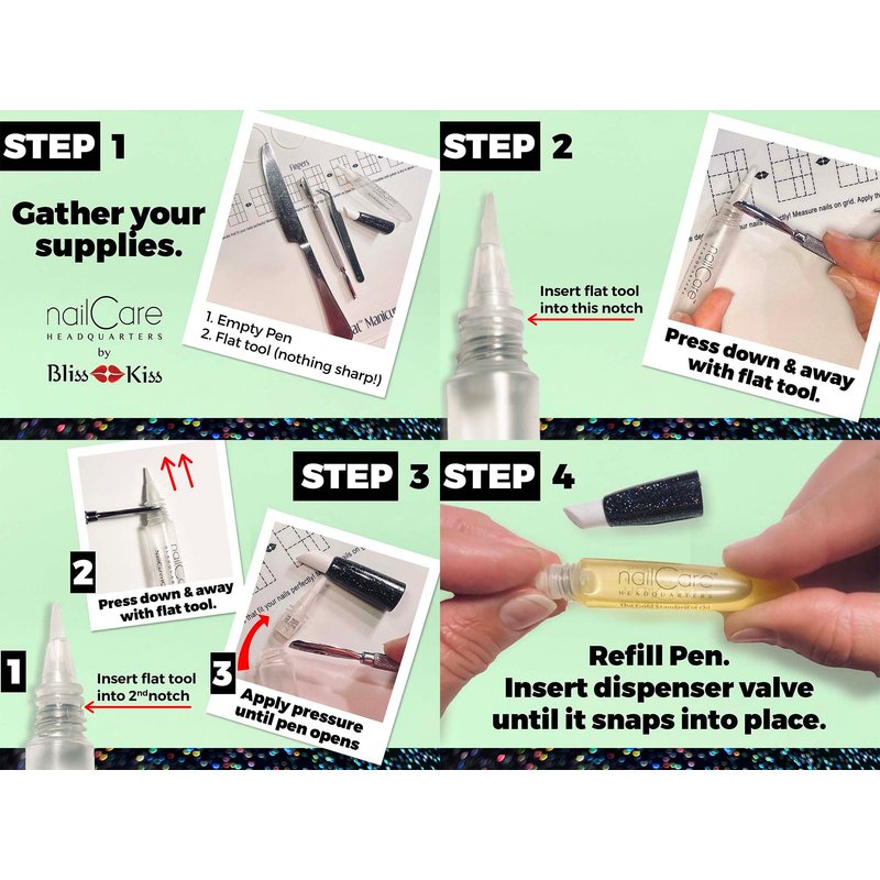 - Beautiful. Refillable. Sparklier. Squeezier. The new Holographic Cuticle and Nail Oil Pens from Nail Care Headquarters by Bliss Kiss will change your nail care routine forever. Designed and crafted with you in mind, these pens are beautiful, durable and actually reusable.