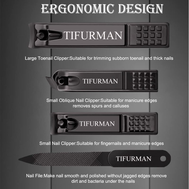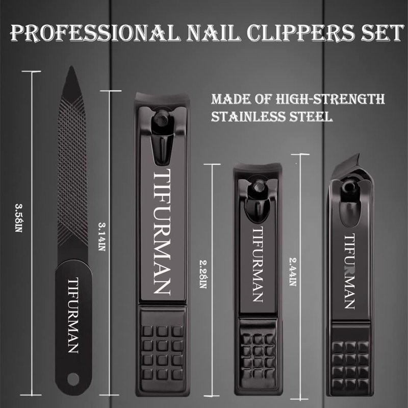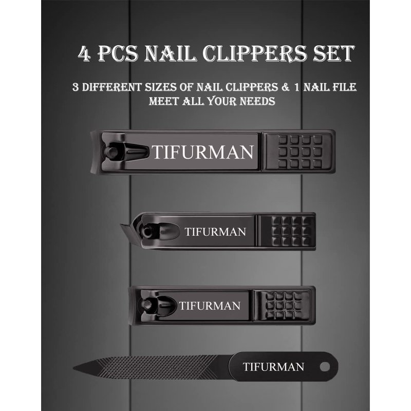- Professional Nail Clippers Set:Tifurman Nail Clippers Set includes Largenail toenail clipper, fingernail clipper, oblique nail clipper and nail file. This set meet your manicure needs and fit your fingernail, toenail, thick nail and ingrown nails. Perfect gift Nail clippers for men and women!