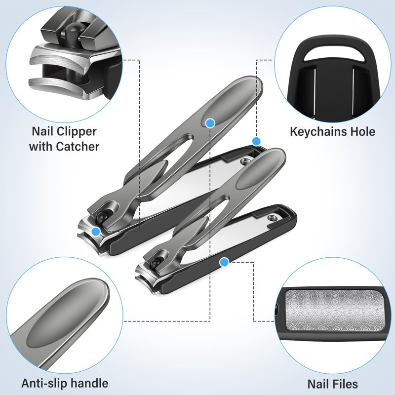 - 【No Splash Storage Box Design】GJNL nail clippers with catcher can collect the debris that fall when you manicure your nails, no more need to sweep up the splattered nail clippings and keep your home or office tidy. Please slide the bottom catcher to the tip before your manicure, and then slide the cover down to pour out the nail clippings after your manicure is finished.