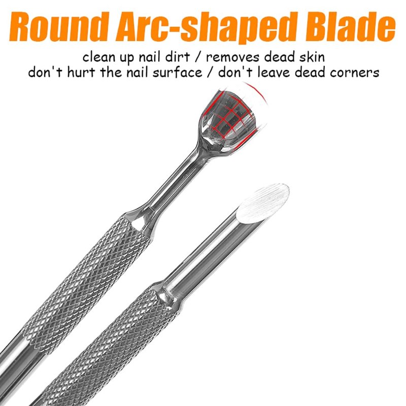 • ➤【Double Head Cuticle Pusher】Dual head nail cuticle pusher, horseshoe shaped pusher fits the curvature of the nail surface and pushes the dead skin into a pile, and the beveled pusher easily pushes up the stubborn dead skin and can also be attached to sandpaper for polishing nails.