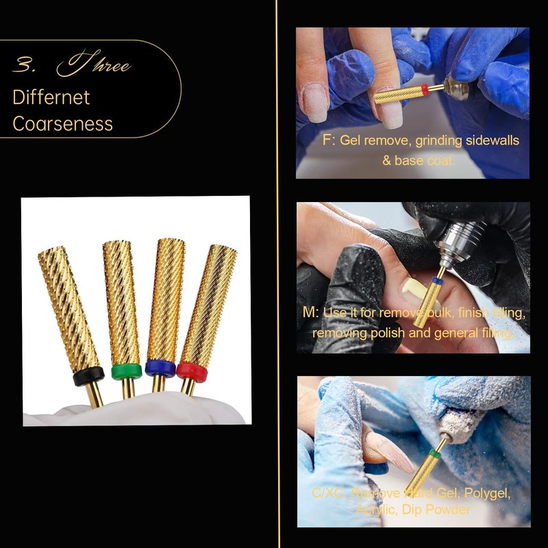 - Different Size for your need: The super long barrel series drill bits have 4 different sizes. Fine bit can remove base coat. Middle Bit can remove soft gel nails. Coarse/ Extra coarse can remoce hard gel, polygel, acrylic nails.