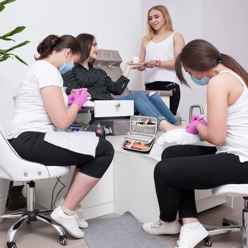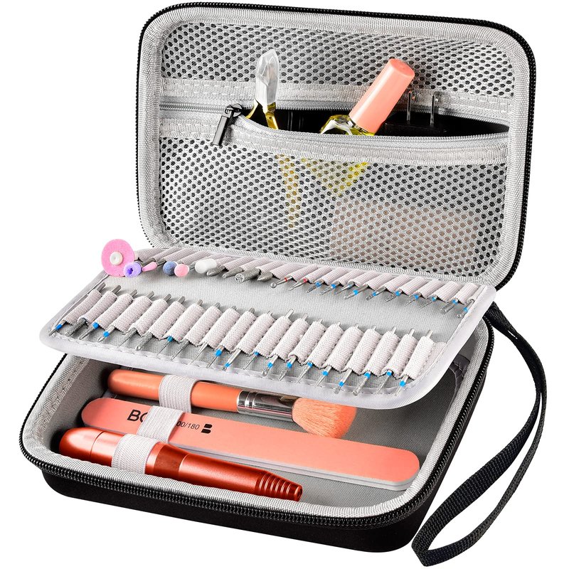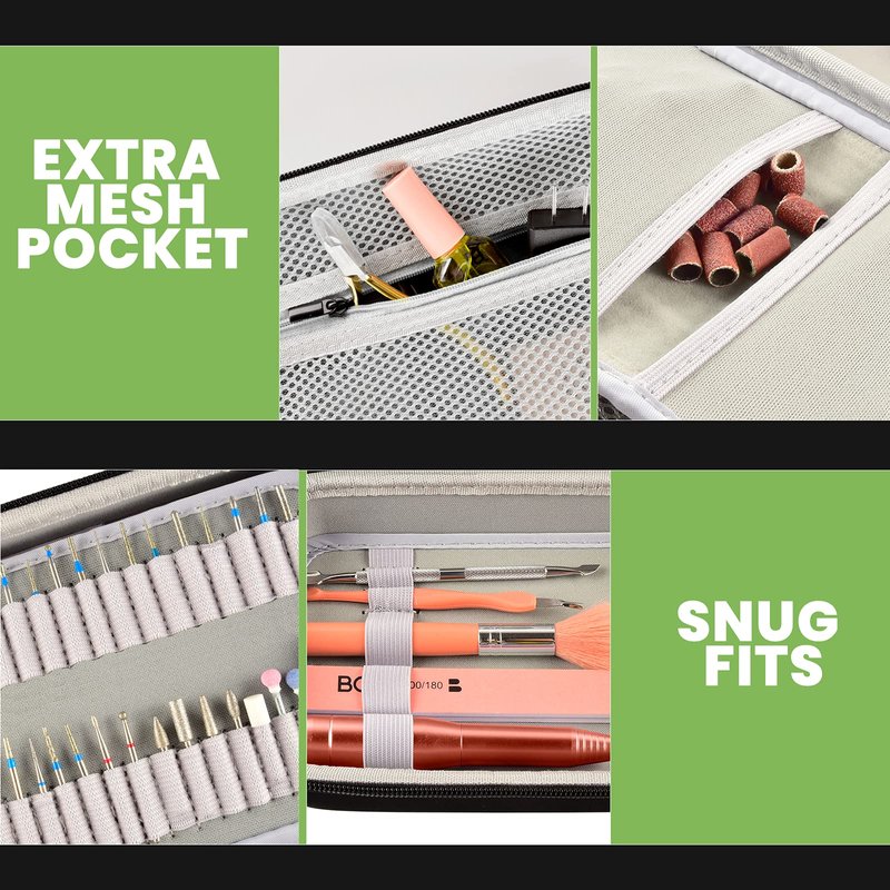- CASE ONLY, NOT INCLUDE DRILL BITS -This nail drill organizer has one divider design(40 nail drill bits slots; double pocket in the back) enough space to store most portable nail drill tools, most types of nail drill bits, sanding bands, acrylic nail tips, convenient design(zipper mesh pocket with the 5 nails drill machine elastic band) to store your portable nail drill machine, charging cable, nail polish and other accessories.
