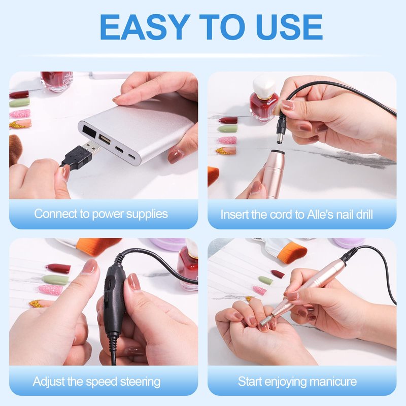 - EASY TO USE - Our nail drill cord is suitable for most electric nail drill compact portable e-file. Just connect to the power supplies and insert the cord into the drill, toggle the switch to adjust the speed and direction, then you can begin enjoying your nail art journey.