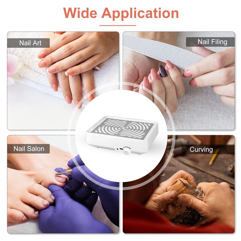 - Upgraded Nail Vacuum Collector -- Adopt 2nd generation powerful motor, with a 100% vacuum effect, it can easily collect acrylic nail powder, gel polish powder, and dip powder, providing you with a clean nail table, perfect for nail salon and at-home use.