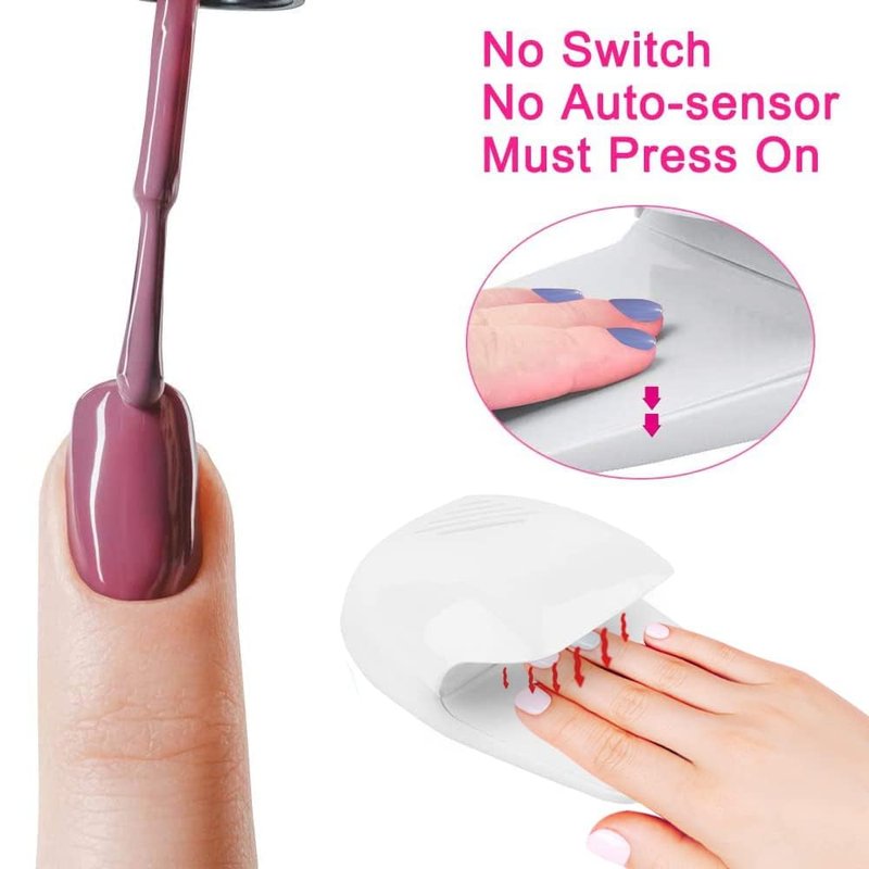 - No Switch, No Auto-sensor, Must Press: Portable nail dryers for both hands and toe nails. The dryer will switch on automatically when the rest stand is pressed, convenience to use! Portable size and battery operated make nail dryer easy to move around and use.