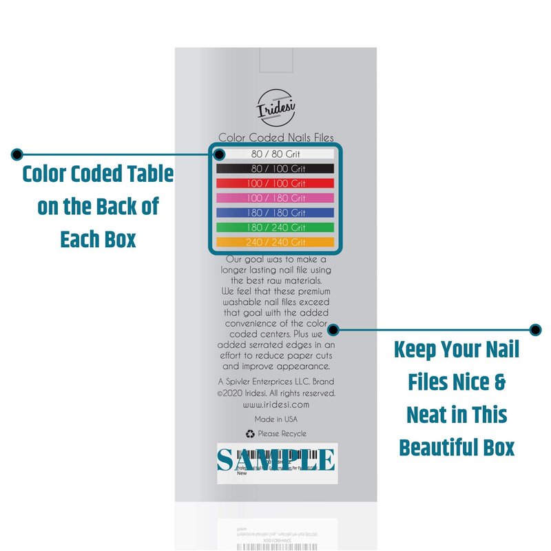 Iridesi professional nail files feature a unique design that offers a durable sandpaper exterior with a semi flexible polystyrene core for superior effectiveness and durability. The nail files sturdy construction withstands repeated use while maintaining its ability to perform longer than nail files made of lesser quality. Iridesi nail files can be used on all types of finger nails including natural nails and false nails such as acrylics and gels.