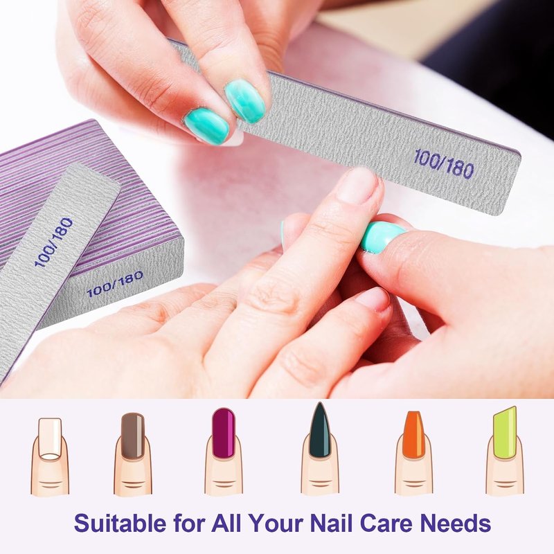 - 100/180 Grit Dual-Sided Nail Files: Each package contains 12 double-sided nail files, with one side featuring a coarse 100-grit texture, ideal for acrylic and thick nails, while the other side boasts a fine 180-grit texture, perfect for buffing away nail surface imperfections or refining natural nails.