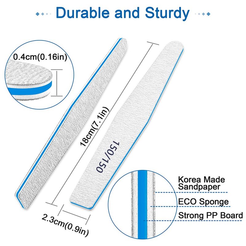 - 【EXCELLENT NAIL FILE TOOLS】Perfect size of 7.09 x 1.10 x 0.16 inches, made of Korean sandpaper, ECO sponge and strong PP board, The half-moon shape is perfect for close cuticle work, while the straight edge is suitable for sidewall and extension edge refinement.