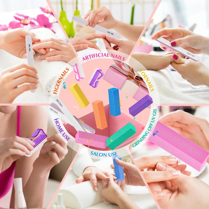 - Professional Nail Files and Buffers set: Package comes with 6pcs 100/180 grit double sided emery board nail files,6pcs 120 grit nail buffer blocks, 2pcs nail brushes. Must have in nail salon and DIY nail art at home.Ideal gift for people who love nail art.