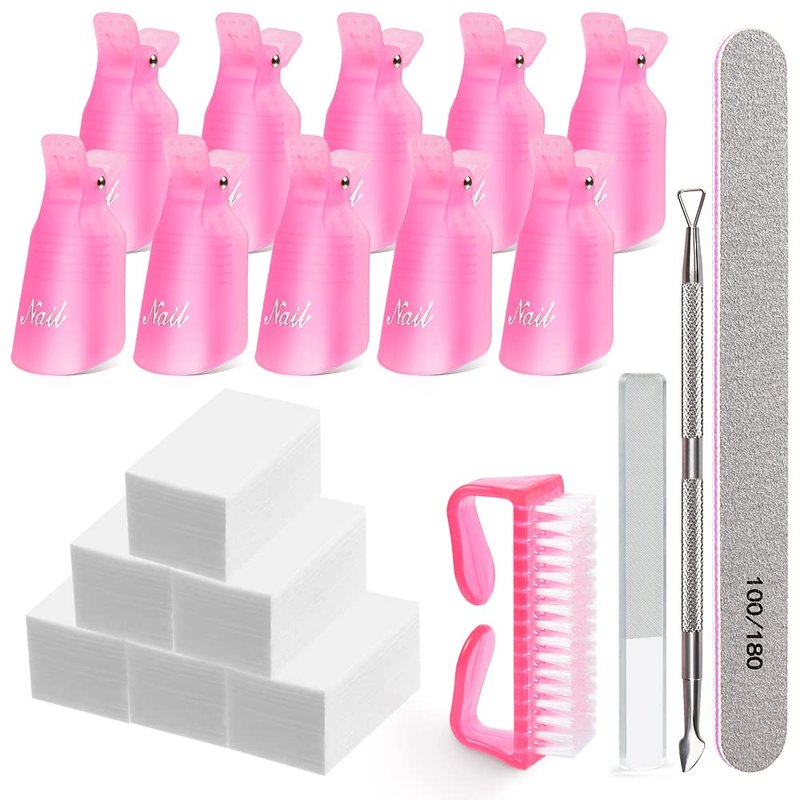 Nail Polish Remover Clips, MORGLES Gel Nail Polish Remover Kit with 10pcs Nail Clips 300pcs Cotton Pads 100/180 Nail File Glass Nail Shiner Cuticle Pusher and Brush-Pink