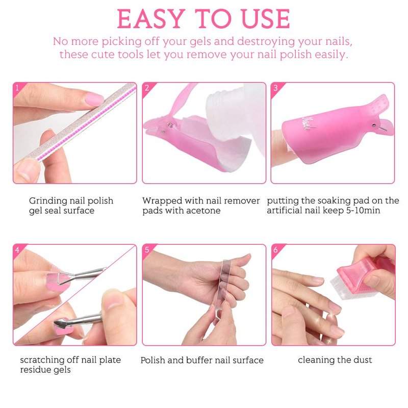 - Easy and Safe to Use: Professional nail remover tool provide a salon solusion at home, only 5 steps (Grind, Wrap, Clip, Scratch, Polish), plastic nail caps combined with nail wipe cotton pads can easy picking off your gels and no destroying nail bed and cuticle, no more worries that your nail get fragile due to roughly nail polish removing way.