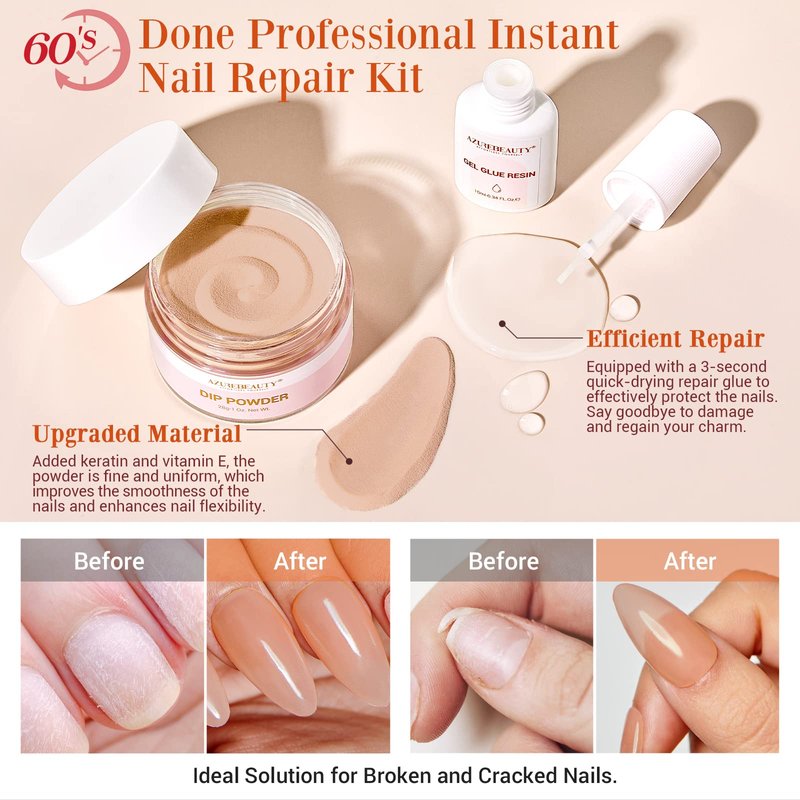 - 💅【What U Get】Portable nail repair kit comes with 1* Nude Brown Dip Powder(1 Oz/28g, Close to Natural Skin Tones), 1*Quick-Drying Repair Glue(10ml), 1*Nail File, 1*Nail Buffer. To repair broken and crack nail tips, AZUREBEAUTY provides a perfect solution for you! Say goodbye to split&weak nails.