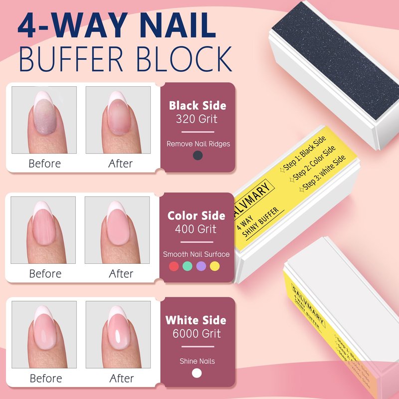 - All in One 4 Way Nail Buffer and Shine Kit - This nail buffer block designed with 4 different effects side, 1 Black Side to file and removes ridges, 1 Color Side to smooth, 2 White Side to polish. Suitable for both natural nails and artificial nails.