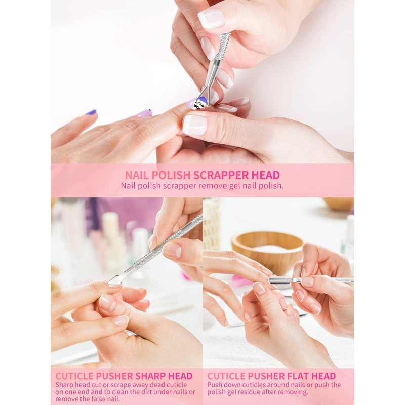 - Cuticle peeler & pusher cutter: the cuticle peeler can help you easy to remove the gel polish and the pusher cutter can scraoe away or cut your dead skin. Both of them are made of stainless steel and easy to use.