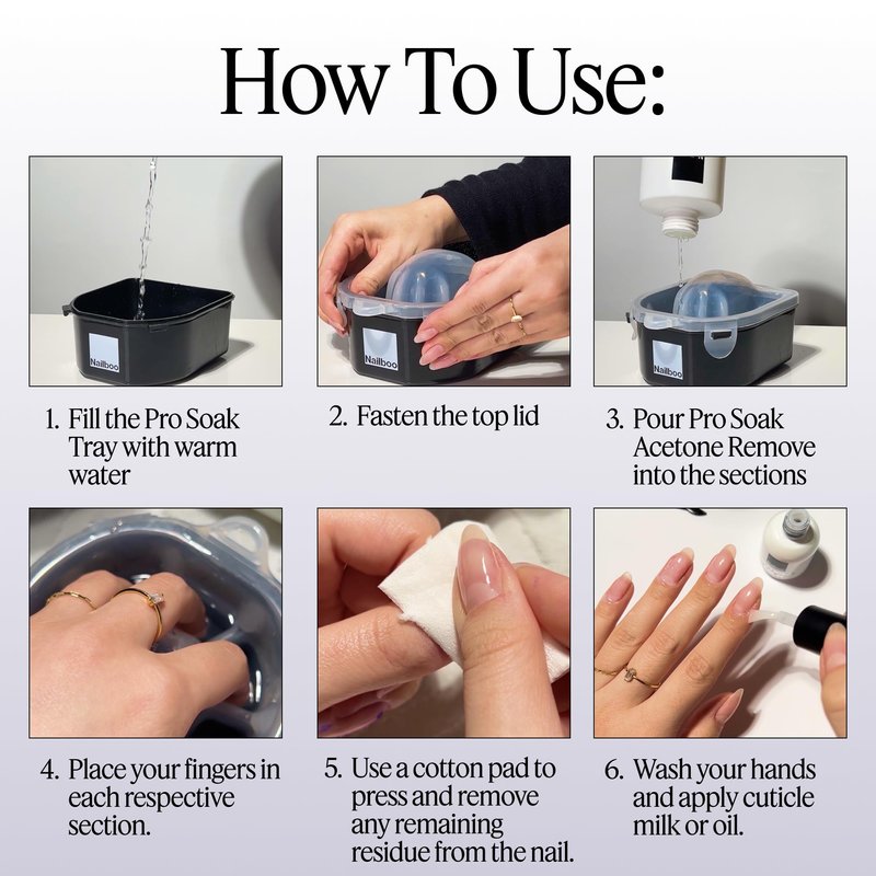Our Pro Soak 100% Pure Acetone Remover helps to remove nail polish, nail polish gel, glitter polish, dip nail powder, acrylic nails, and nail glue quickly and gently. Whether you use clear gel polish or acrylics, watch this salon-quality Acetone Gel Nail Polish Remover work for pretty much any nail formula. The Acetone Gel Remover for Nails can be used in a wide variety of ways—apply to a cotton round for traditional removal, use with plastic clips, or pour it into our nail soaking bowl (sold separately). Nail soak off bowl is included.