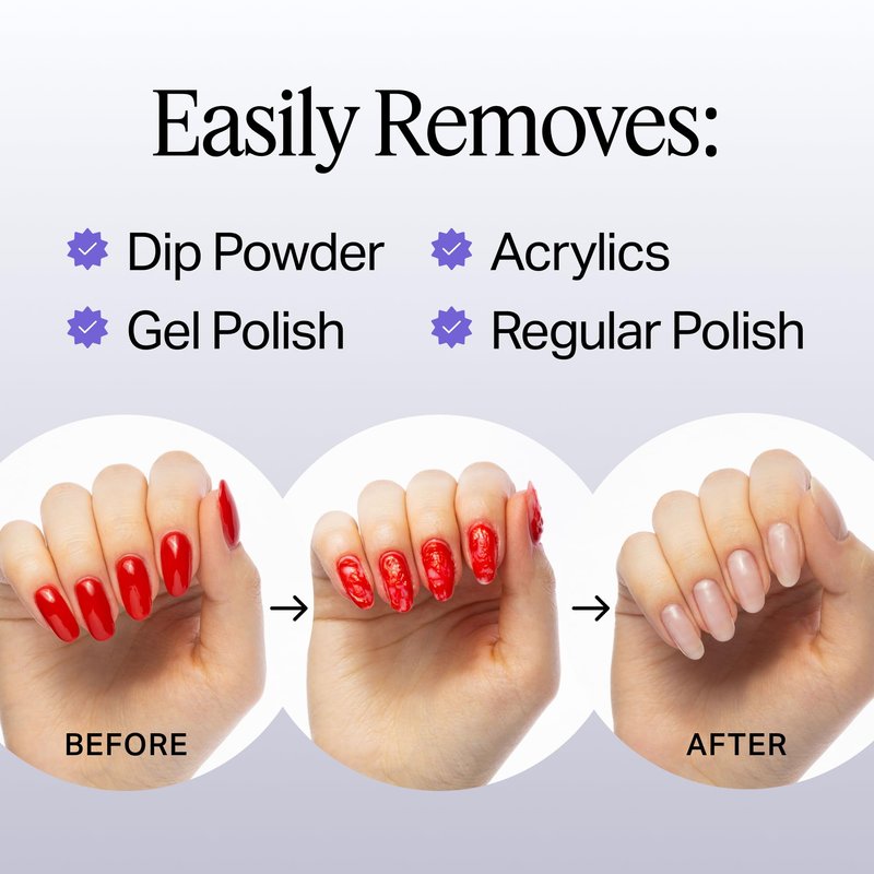 - REMOVES ANY MANICURE/PEDICURE: This fingernail polish remover works on all nail treatments and can be used a variety of ways, including on artificial nails. Apply to a cotton round for traditional removal, use with plastic clips, or pour into the included soak off bowl.