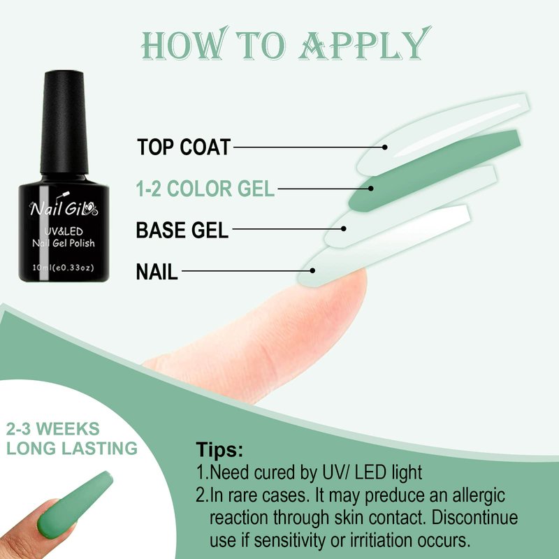 • Long-Lasting : The series of green gel nail polish set is long lasting for 21+ days with perfect shine under proper application - With base gel top coat under the full application process.