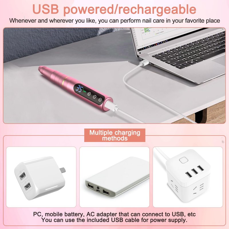 - COMPACT & PORTABLE DESIGN: Don't let your beauty routine slow you down! The T5A nail drill machine is designed to be portable and easy to use on the go. Its sleek and lightweight aluminum alloy body ensures a comfortable grip, while its wireless USB Type C charging feature allows you to charge it anywhere, anytime. Stay stylish and effortlessly maintain beautiful nails wherever you are.