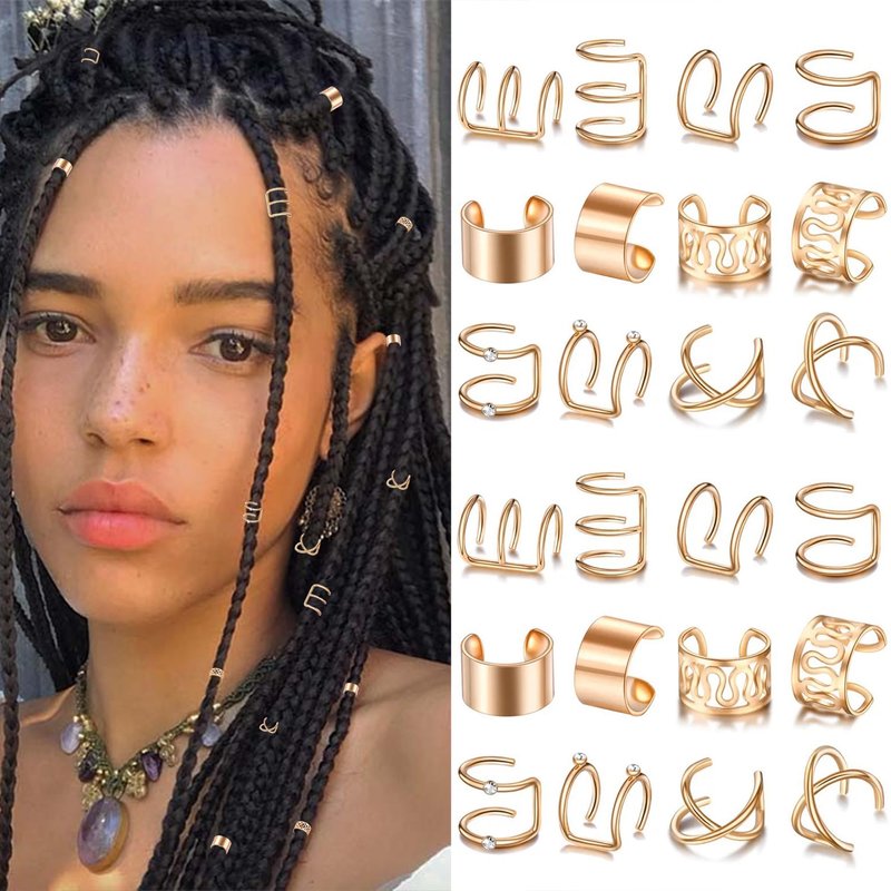 NAISKA 24PCS Gold Hair Jewelry for Braids with Crystal Rhinestone Loc Dreadlock Beads Accessories Earring Non-Piercing Ear Cuffs Clip Jewelry for Women Men Hair Accessories Braids