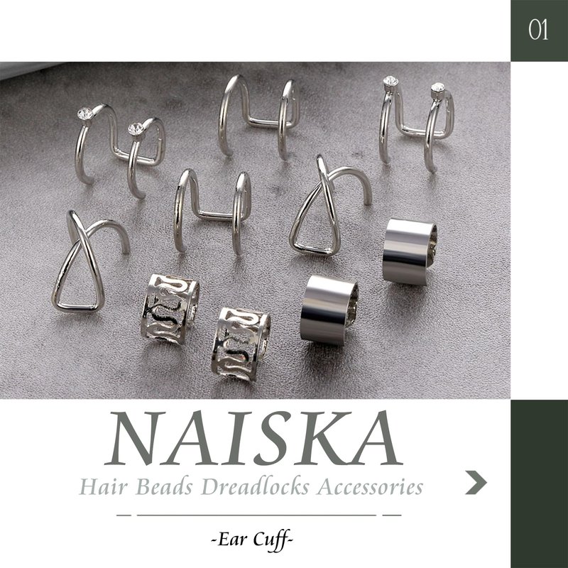 NAISKA 24PCS Hair Jewelry for Braids with Crystal Rhinestone Loc Dreadlock Accessories Metal Alloy Braid Clips Non-Piercing Ear Cuffs Locs Jewelry for Women Men Hair Accessories(Silver)