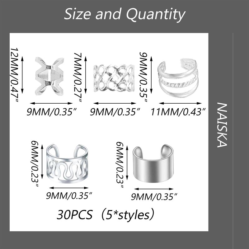 NAISKA Silver Jewelry for Braids, Dreadlocks and Beards - Metal Braid Clips, Non-Piercing Ear Cuffs, Hair Cuffs, and Beads for Women and Men (30PCS)