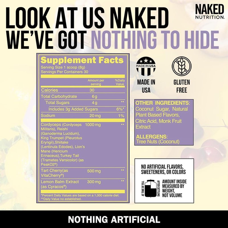 - ADAPTOGEN POWDER: Naked Recovery is a premium recovery powder formulated with six adaptogenic mushrooms grown in the U.S., tart cherries, and lemon balm to support post-workout recovery and promote general health.