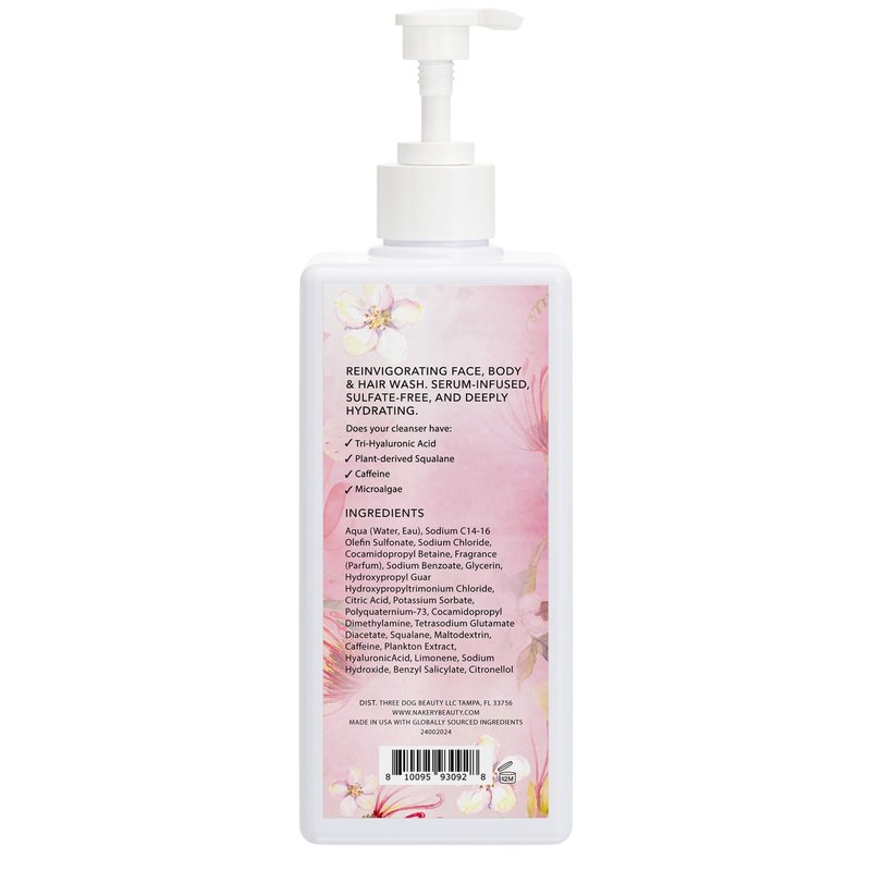 Nakery Beauty’s hypoallergenic body & hand wash is super concentrated & has a rich, creamy foaming lather that naturally cleanses skin to remove deep seated dirt & impurities, leaving skin soft, smooth, & refreshed. Our natural body wash for women penetrates deeply to deliver an extra boost of hydration, keeping skin balanced & healthy. This hydrating body wash also helps replenish nourishing moisture for softer, smoother, & more radiant skin. Nakery Beauty’s clean body wash also helps to visibly reduce the appearance of fine lines & wrinkles for younger-looking skin! This hyaluronic acid body wash delivers multi-level hydration to noticeably improve skin tone & texture. This non toxic body wash is clean beauty—vegan, cruelty-free, SLS & SLES-free, & 100% made in the USA. This eczema body wash is infused with tri-hyaluronic acid, caffeine, plant-based squalene, arctic micro algae, & other powerful natural ingredients to reinvigorate the skin from head to toe. Key Ingredients: Sugar Cane Squalane. The purest form of squalene derived from sugar cane, which helps increase cell turnover and boost elasticity. Tri-Hyaluronic Acid. Balanced ratio of high, medium, and low molecular weights of hyaluronic acid to deliver multi-level hydration while helping plump up the skin. Caffeine. Antioxidant-rich ingredient to wake up the body and reduce unwanted dimples Pure Arctic Microalgae. On the volcanic island of Iceland, the glacial waters and volcanic minerals combine to create the purest nutraceutical form of red algae that works to rejuvenate on a cellular level. Plankton Extract. Helps with premature skin aging and prevents pollutants and toxins from entering the skin.
