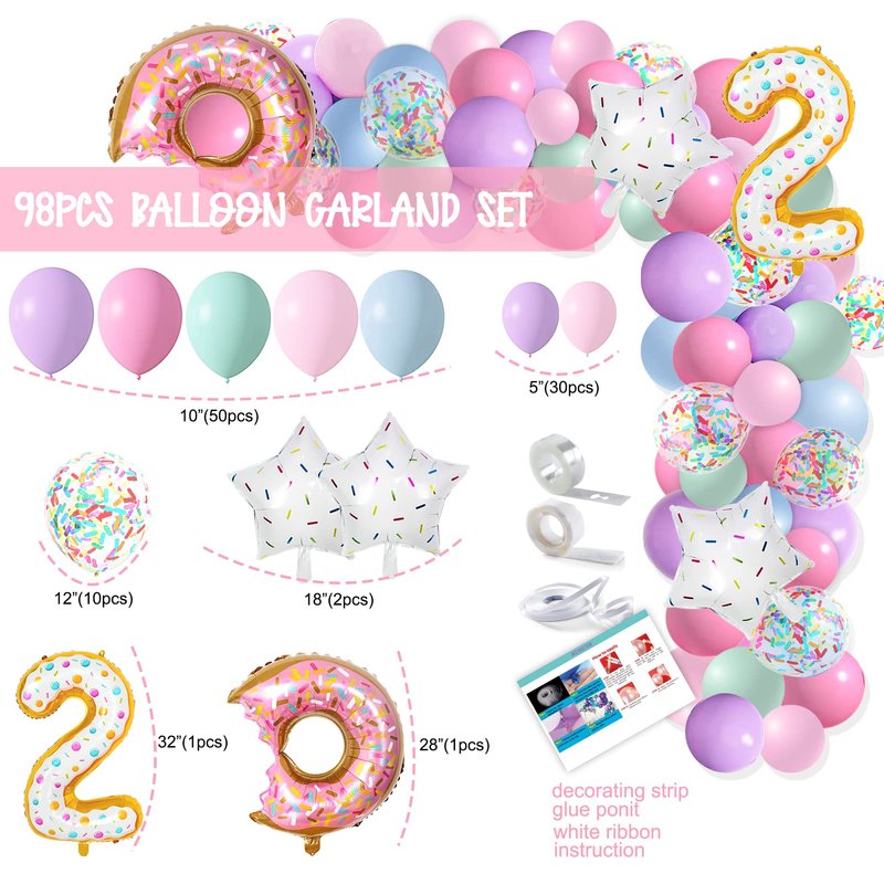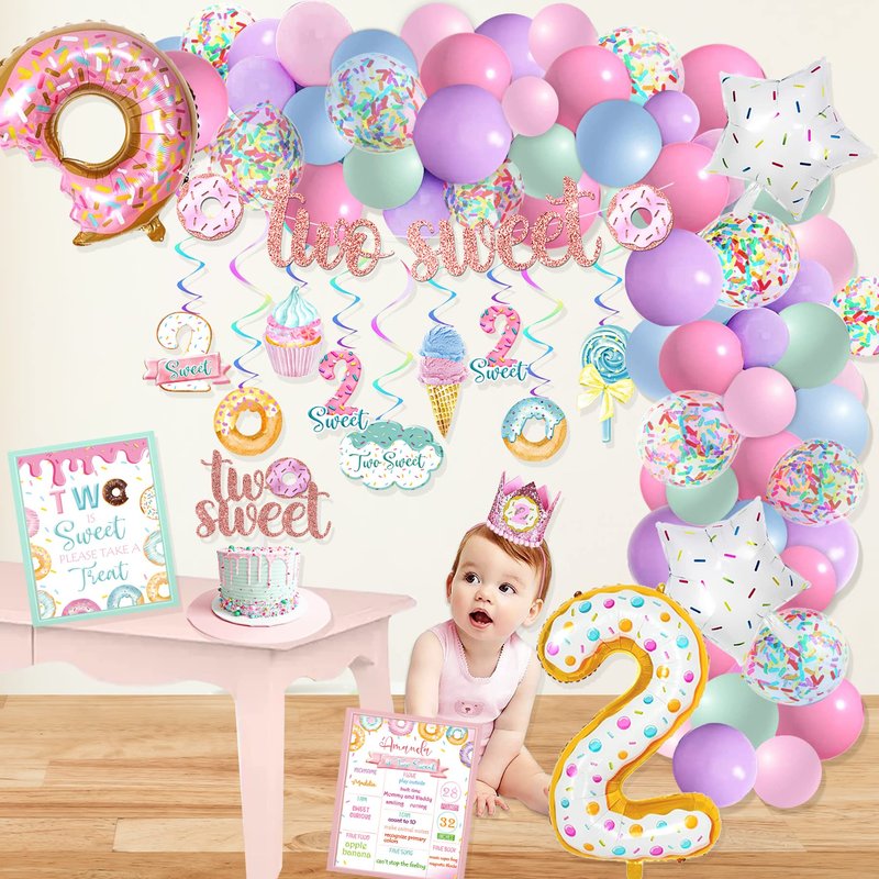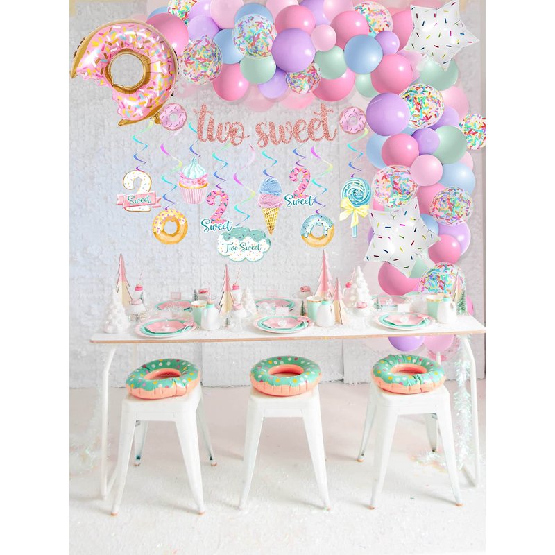 - Two Sweet Birthday Decorations for Girl - Package include: TWO SWEET banner, TWO SWEET cake topper, 98pcs donut balloon garland set(90pcs latex balloons + 2pcs star balloons + 1pcs giant number 2 balloons + 1pcs giant donut foil balloon + 3pcs balloon garland tools + instruction), 9pcs donut hanging swirls, 2pcs poster, 1pcs two sweet birthday crown.