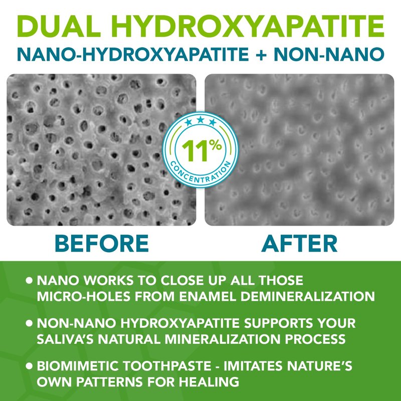 - SUPERIOR TOOTH REMINERALIZATION: Our mineralizing toothpaste has a low RDA (relative dentin abrasivity) of 87 & a pH range of 7.2 - 7.4 for optimal enamel protection. With an 11% concentration of a unique bioavailable nano and non-nano hydroxyapatite formulation, our dentist researched formulation targets sensitivity and remineralization from two paths using the nano to dig deep into your damaged enamel and the non-nano hydroxyapatite to support your saliva’s natural mineralization process.